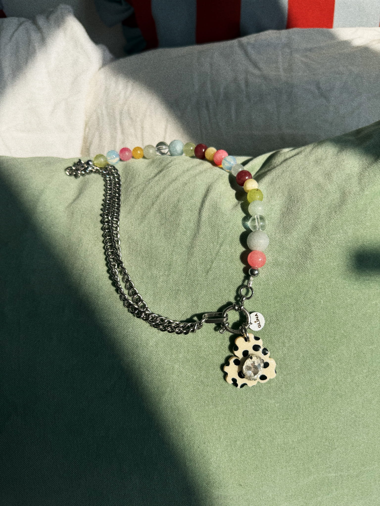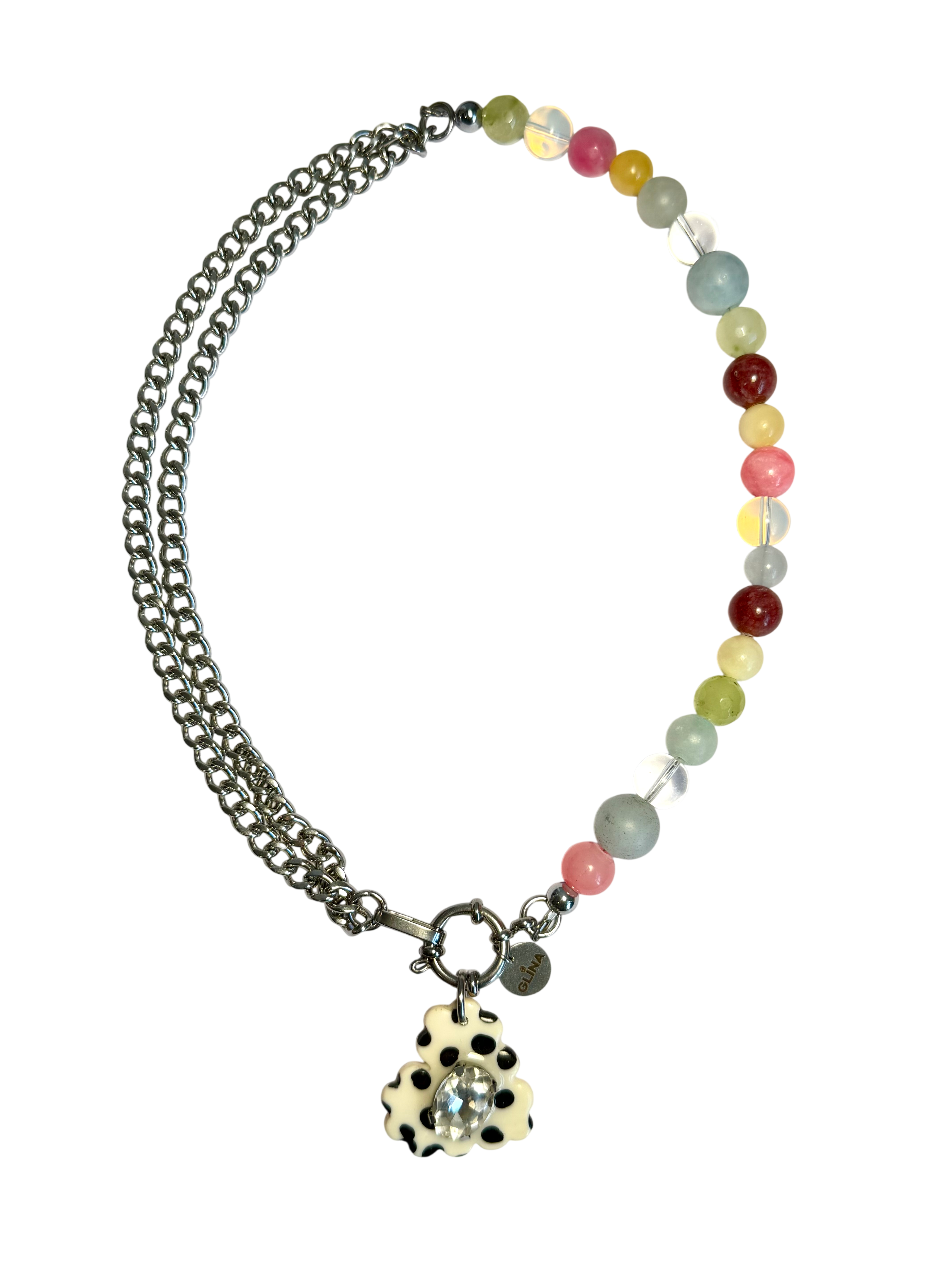naszyjnik wykonany pół na pół z koralików szklanych i jadeitowych oraz łańcucha z nieuczulającej stali szlachetnej